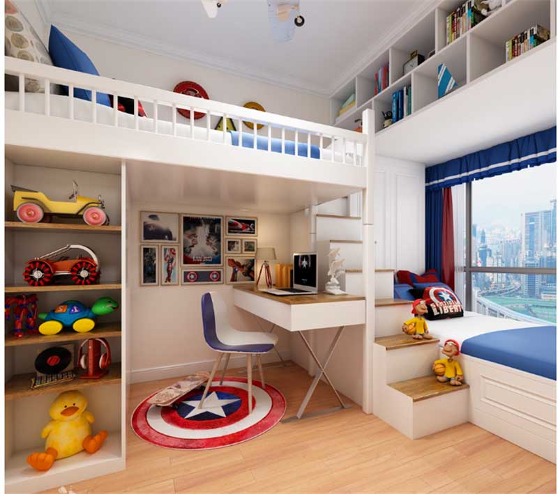 如果兒童房的空間比較大,雖然可以設置兩個單人床,但是這卻大大壓縮了孩子在臥室內的活動玩耍空間,相對來說,高低床的優(yōu)勢更加的明顯。