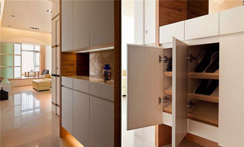 鞋柜安裝在進(jìn)門(mén)的位置,為了更加的美觀,節(jié)省空間,那么內(nèi)嵌式的鞋柜可以很好的實(shí)現(xiàn)這樣的要求,入門(mén)處干凈整潔。