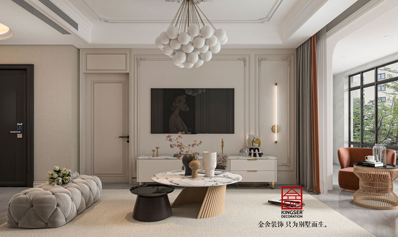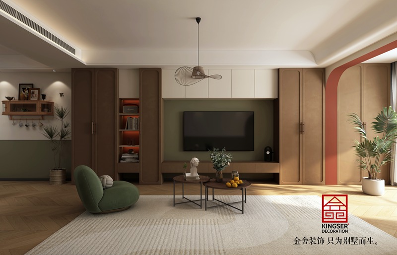 餐廳主墻面做酒柜及水吧增加收納空間,方便制作飲品,冰箱放置在北側陽臺,廚房做高柜內嵌蒸烤一體機,陽臺設置洗烘一體機,預留掃地機器人電源及下水位置,玄關位置放置裝飾性玄關柜,鞋帽柜放置再入戶門外。