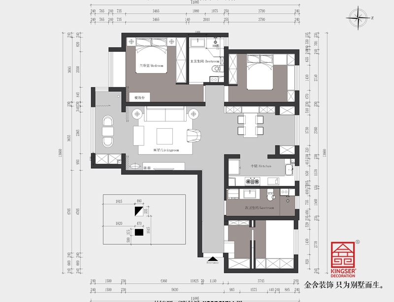 餐廳空間拆除與贈送空間之間的墻體,增大自家空間量,陽臺拆除室外機的墻體,增大自家空間量,因為使用中央空調(diào)外機放置臥室外機位置,臥室新建墻體主要目的是側(cè)板的收口和柜子空間量的擴大.