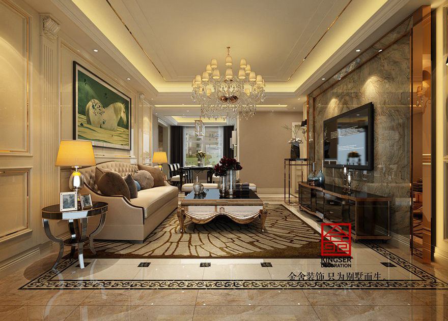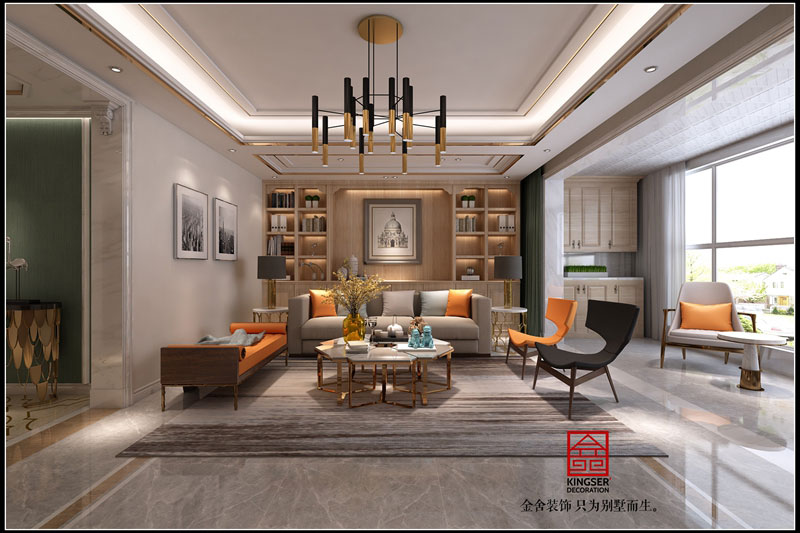 石家莊金舍裝飾設計師深入考察房子結構后,根據業主需求把書房和過道的墻打通,解決了空間狹小問題,坐在沙發上也能看到北面的風景,這樣擴展了空間,同時讓人置身在美好的風景中。同時利用書房的墻面做了整體柜子,解決了次臥沒有儲物空間的局面。