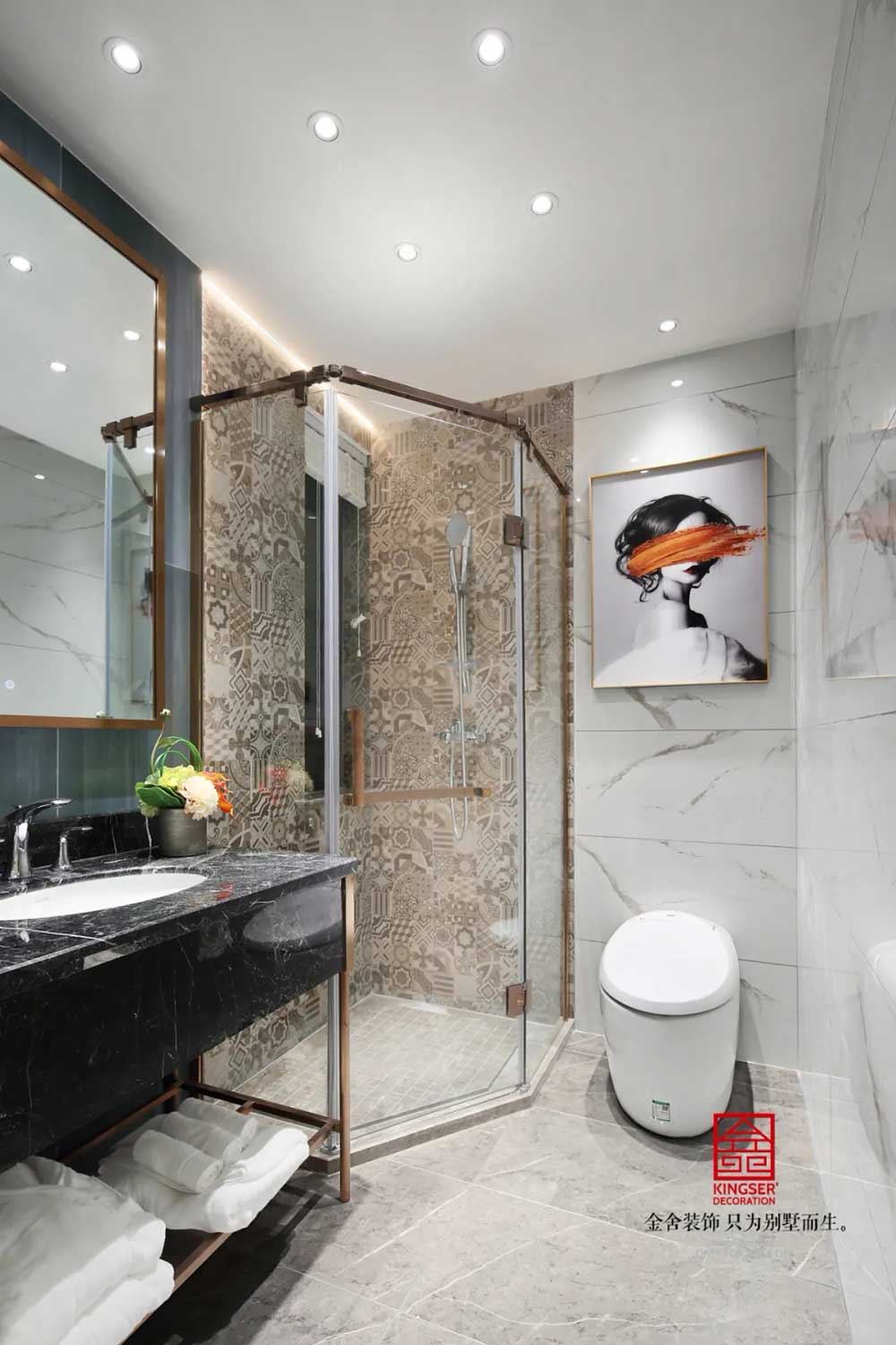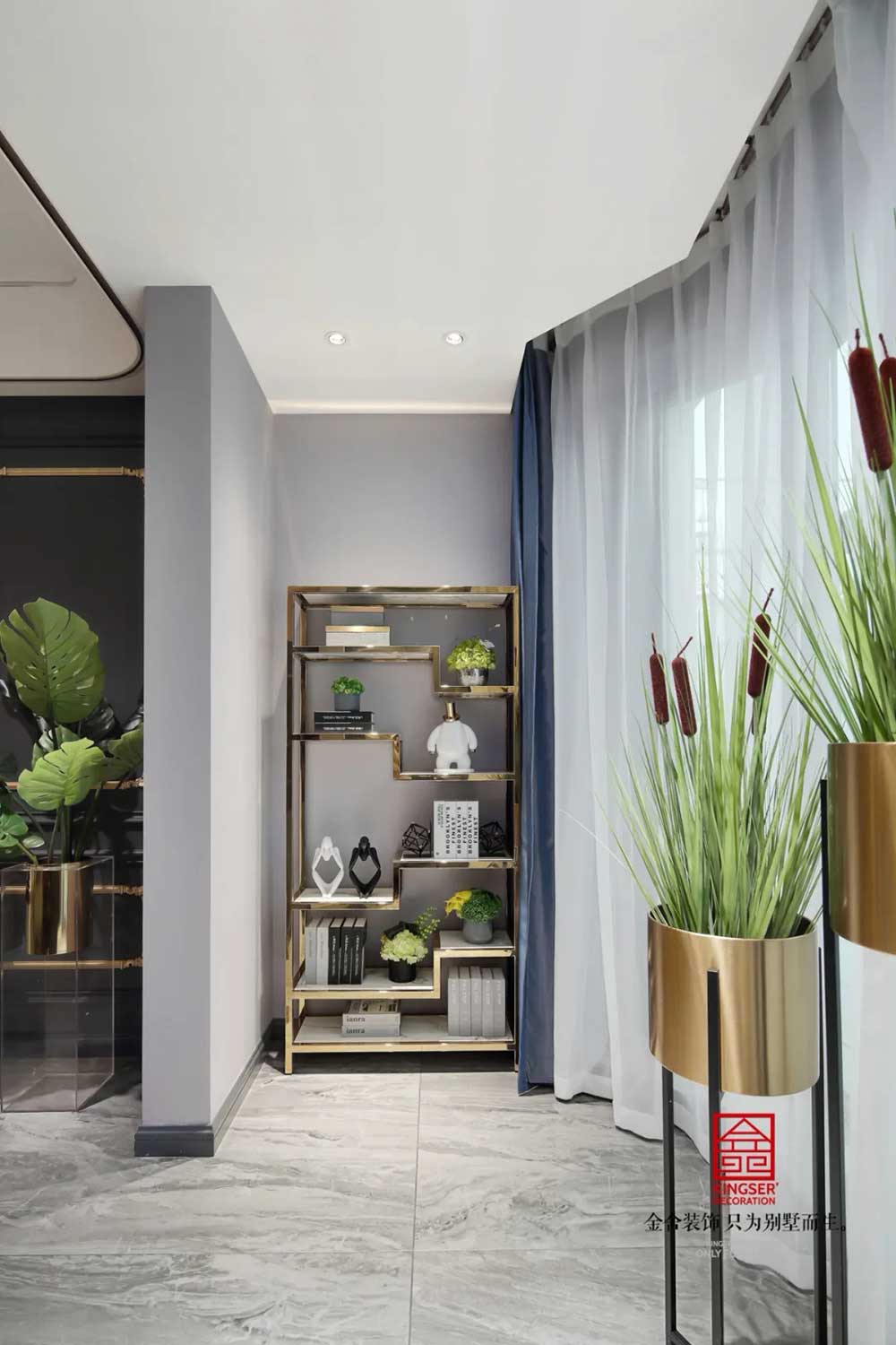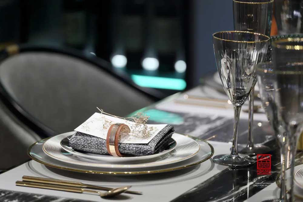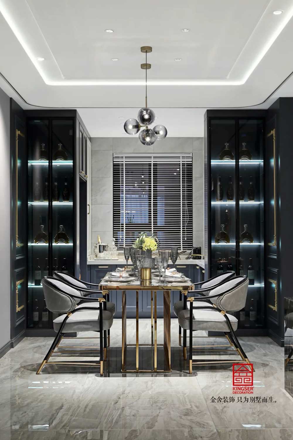 深藍(lán)、古銅和灰色調(diào)勾勒出紳士的高雅格調(diào)和品味。從空間利用到配色處理,匠心獨(dú)具,每一個(gè)空間都濃縮著設(shè)計(jì)師對(duì)新古典的獨(dú)特理解。