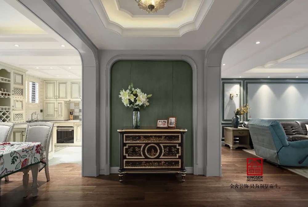 客廳綠色的點(diǎn)綴在靜謐的空間里恰到好處,完美之處在于步入入戶(hù)門(mén)的這一刻,映入眼簾的皆是經(jīng)典簡(jiǎn)約美式元素,圓潤(rùn)的造型、浪漫的素色基調(diào)、溫暖的木質(zhì)材料、極具講究的家具和燈飾。這種享受就好像是在回味經(jīng)典電影中的浪漫情節(jié),灰黃色的記憶,羅曼蒂克的生活。