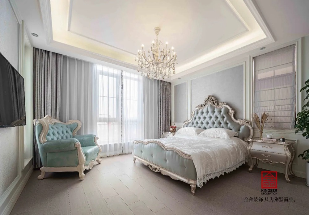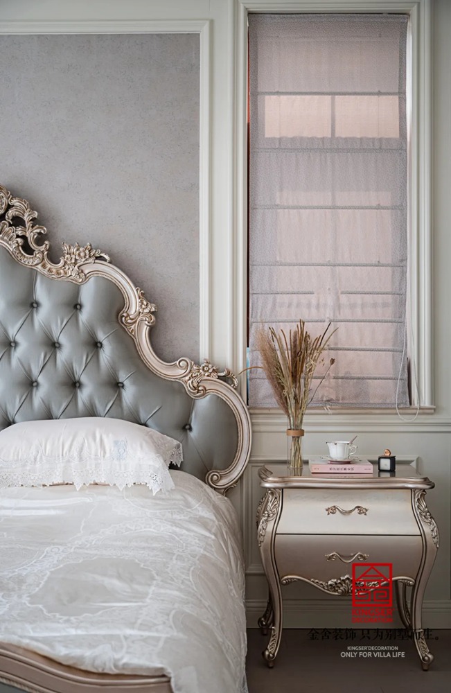 柔軟的床包和床品賦予了空間豐富飽滿的情感,經(jīng)典的歐式裝修風(fēng)格表現(xiàn)奢美華貴的格調(diào),而背景墻上的清淡壁布則為空間帶了清幽的美感,增添清新之色。