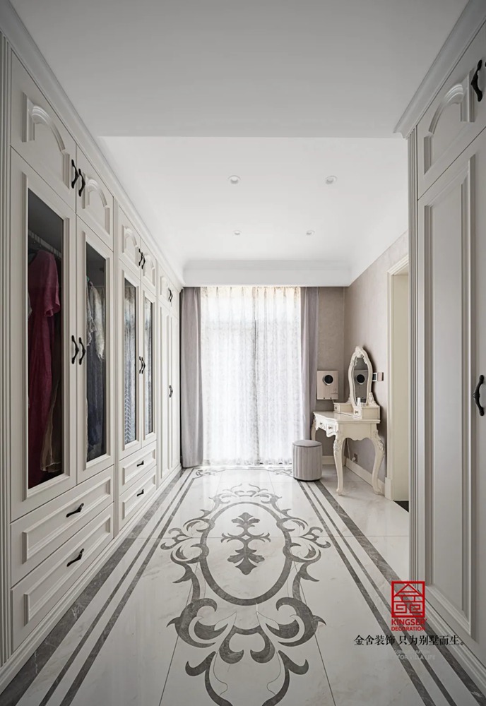 巨大的地面拼花就像在講述一個(gè)唯美的故事,婉轉(zhuǎn)而輕盈,又好似在訴說著那種獨(dú)到的歐式情懷,同時(shí)通頂?shù)囊鹿癖WC了整個(gè)空間的收納和衣物的擺放。