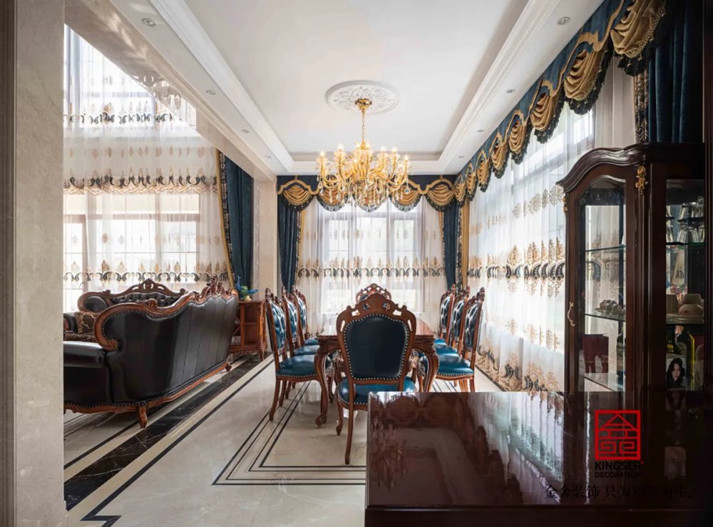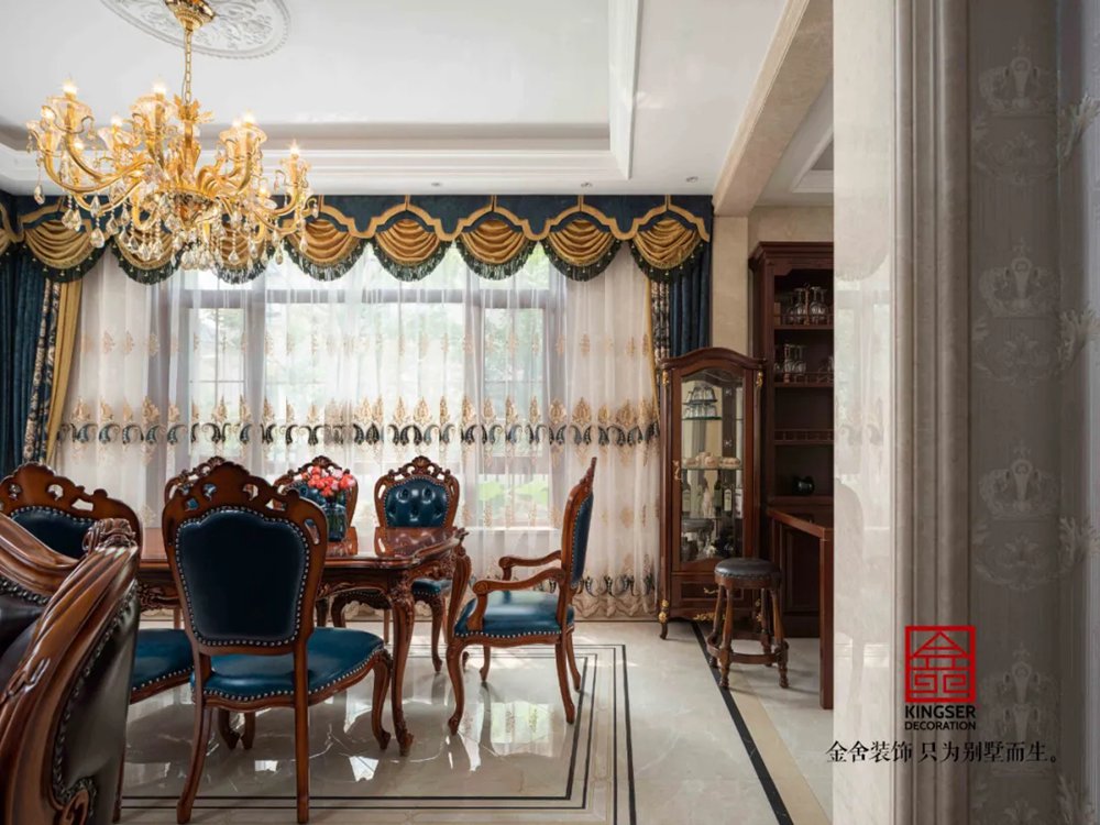 餐廳空間的裝修在設計風格上追求與客廳空間的連續性,以浪漫主義為基礎設計要義,設計師以家居精美的造型展現了主人高品質的生活追求,華麗的裝飾圖案、濃烈的色彩對比讓雍容華貴的裝飾效果自然流露。