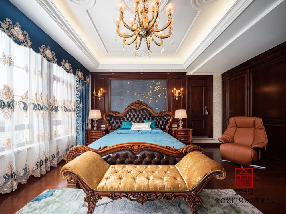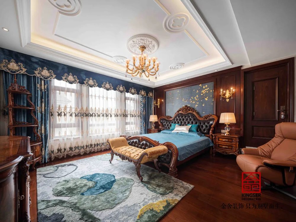 磅礴大氣的設計技巧,無論是厚重的實木地板,還是奢華的歐式家具,還是尊貴典雅的吊頂,都讓整個臥室呈現空前絕后的豪華風格,而整個布置精妙,將各種家具, 裝飾物巧妙的融合在一起,把這種奢華的面貌呈現給人們。