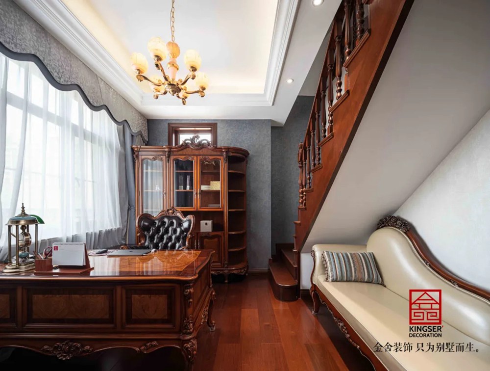 書房建在頂層閣樓的下方,在心情煩躁的時候可以去閣樓感受下自然的陽光和雨露。深棕色實木家具雕刻的花紋體現了設計師對細節的拿捏,獨到的細節之美。