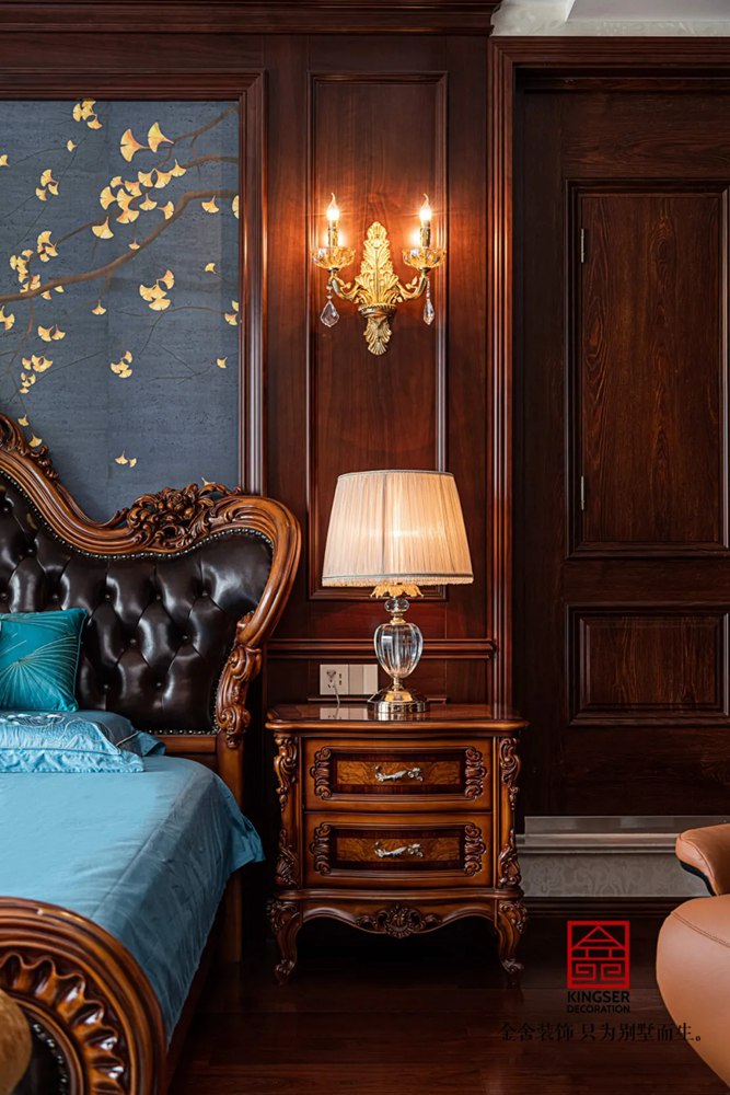 質感極佳的壁紙設計和富有層次的布局設計,凸顯出整體空間的美觀和優雅。銅制的金色水晶吊燈,不但增添了空間的雅致感,更是瞬間豐盈了整體的視覺效果。