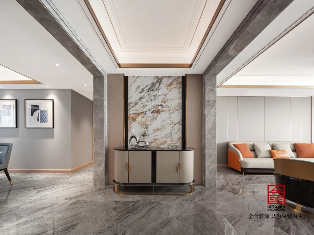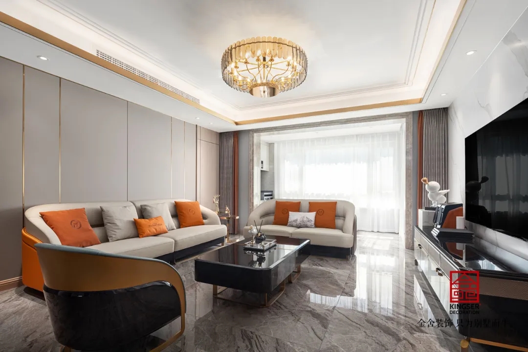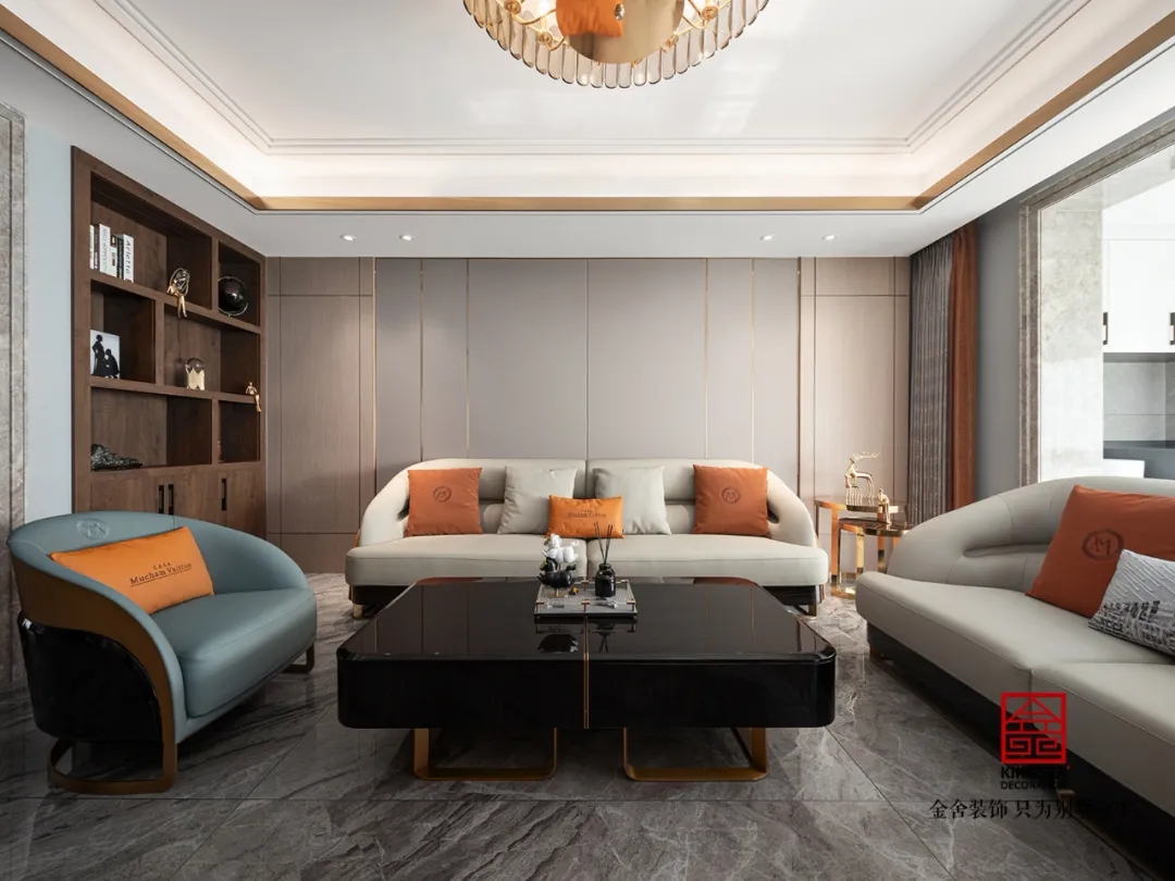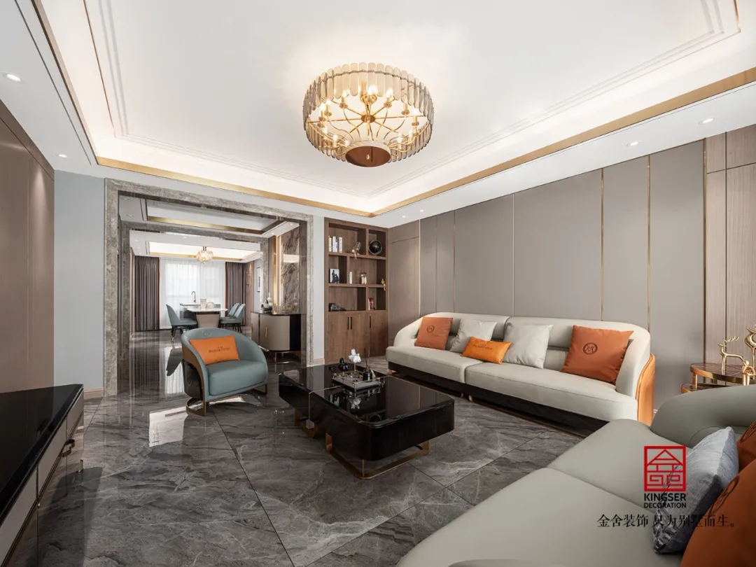 此案例為石家莊金舍裝飾-東南智匯城191平米輕奢風格裝修實景?;疑珜庫o似夜,橙色活力迷人,優雅低調的灰色,給人以夜的寧靜,是包羅萬象的,可以與任何顏色協調。橙色恰如冬日里的陽光,可以是快樂愉悅的,又透出一絲深秋的憂傷。