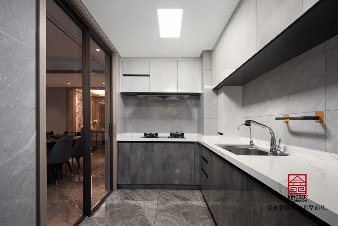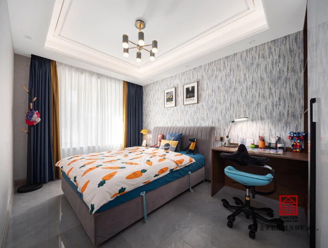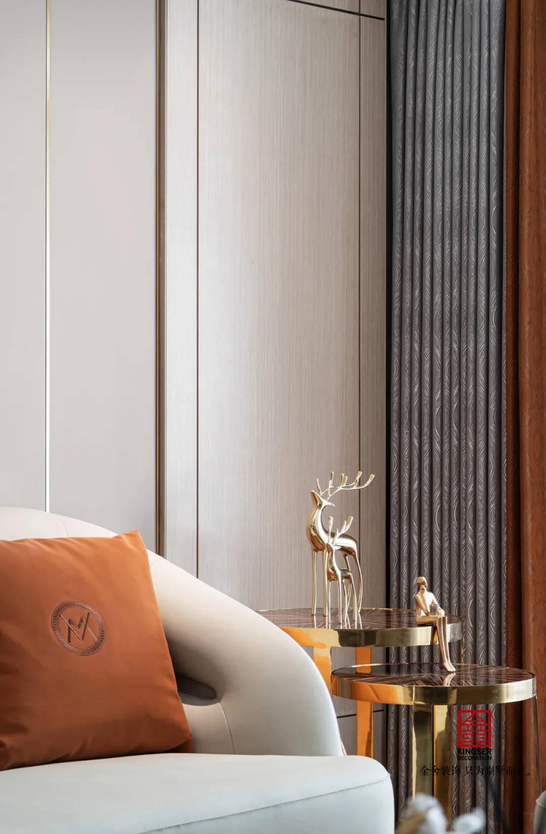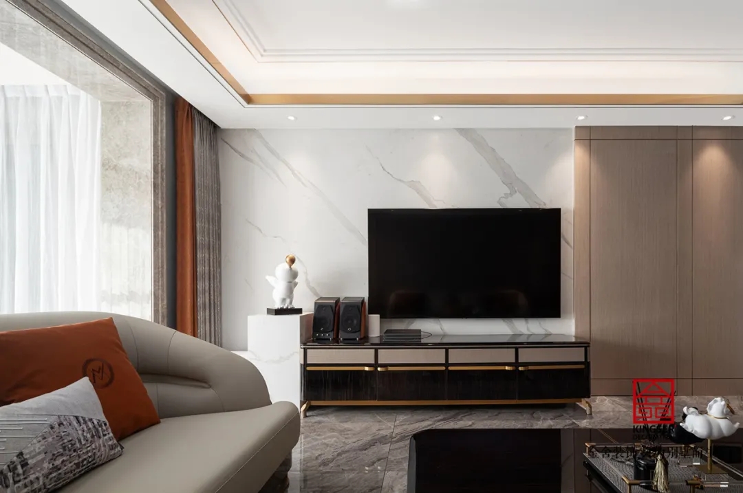 此案例為石家莊金舍裝飾-東南智匯城191平米輕奢風格裝修實景?;疑珜庫o似夜,橙色活力迷人,優雅低調的灰色,給人以夜的寧靜,是包羅萬象的,可以與任何顏色協調。橙色恰如冬日里的陽光,可以是快樂愉悅的,又透出一絲深秋的憂傷。