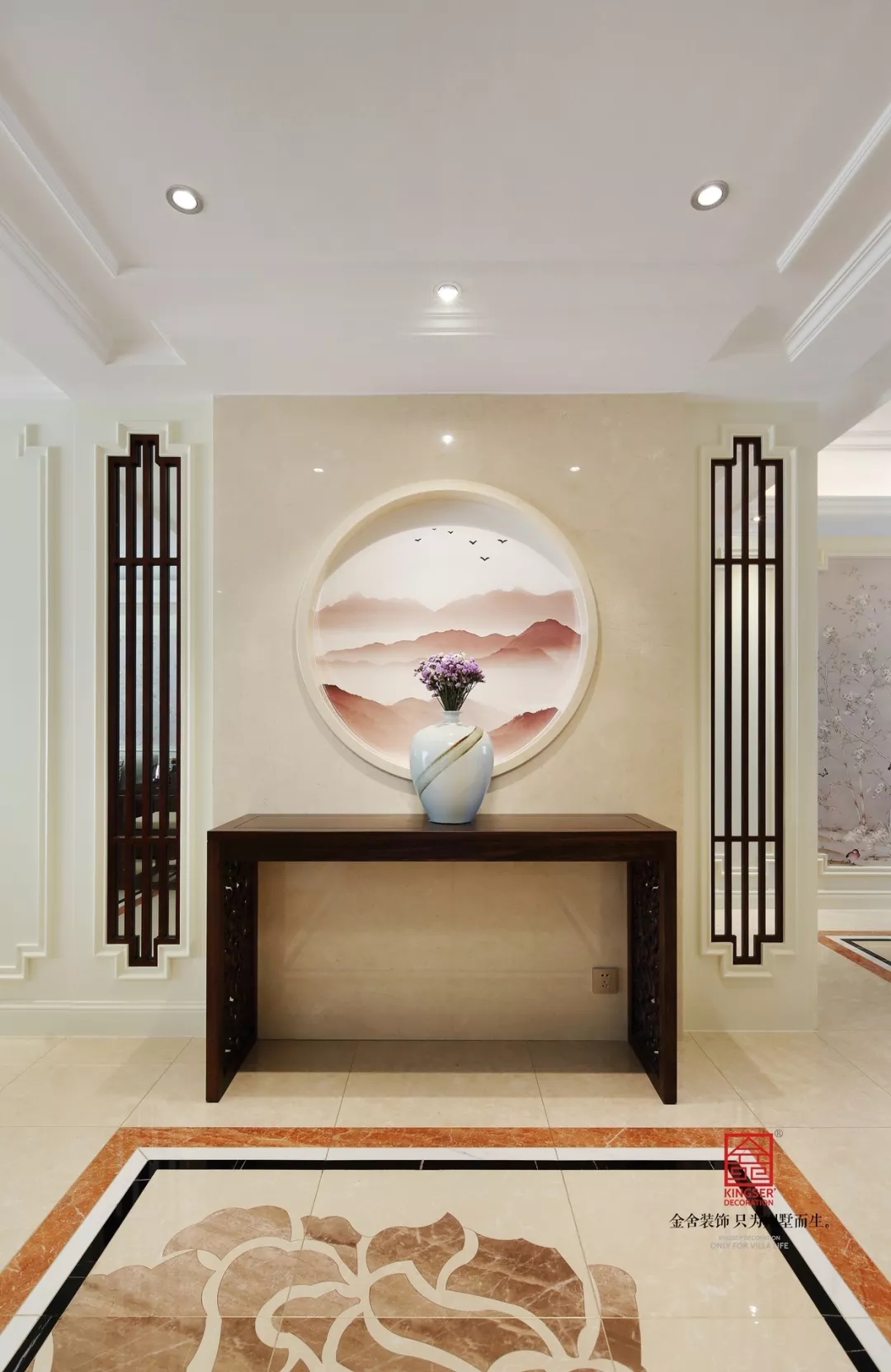 玄關走廊淡素色墻面,質感簡單又沉穩、原始又兼具現代感,圓形的窗棱感覺與水墨風的壁布融為一體,即凸顯出中式風的特色,又形成色調上濃淡界限,增加空間層次。兩邊的木質窗棱簡潔樸質,頂面的射燈映背景墻,為樸厚空間注入柔美與雅韻。