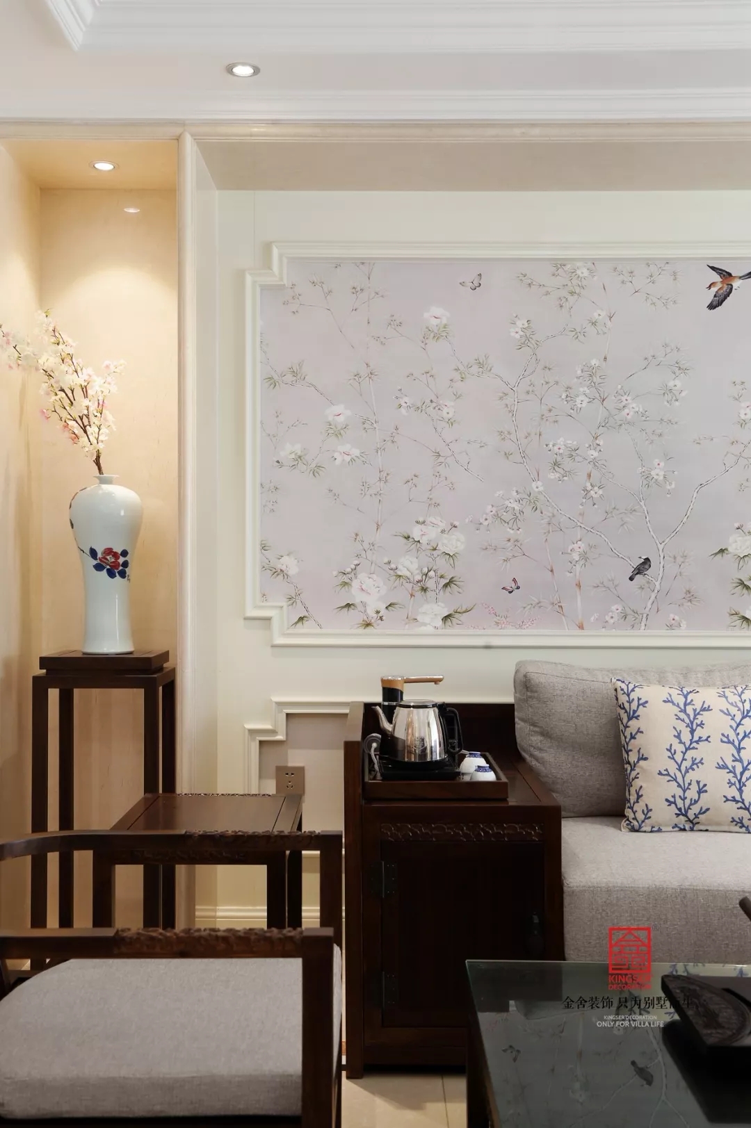 空間里把中西方兩種風格交織融合,碰撞出完美的繪卷,讓你有一種在時光下舒緩閑逸;閑暇時泡一壺清茶,執一縷墨香,聆聽陌上花開的聲音,溫暖了身心的疲憊。