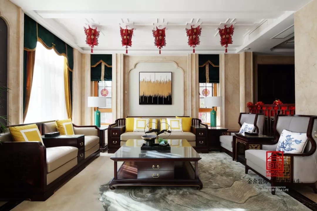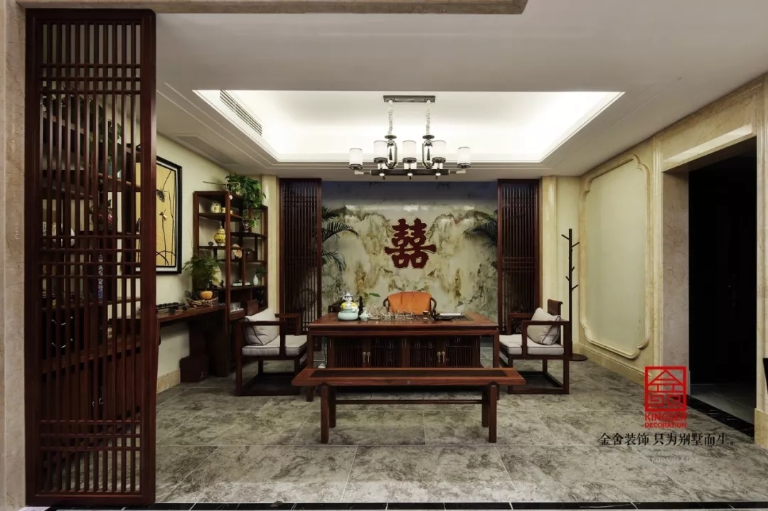 此案例為石家莊金舍裝飾-原河名墅600平米新中式風格裝修實景。沏一杯普洱茶生茶,摘一曲春華絲竹,一花合歡溫心志,是信手拈來的東方古意,竟也能驚艷兩個人的素常歲月。一組桌椅,一縷時光,一眾好友,于陽光深處,傾心布茶盞,笑談四季流轉,對飲山高云淡。