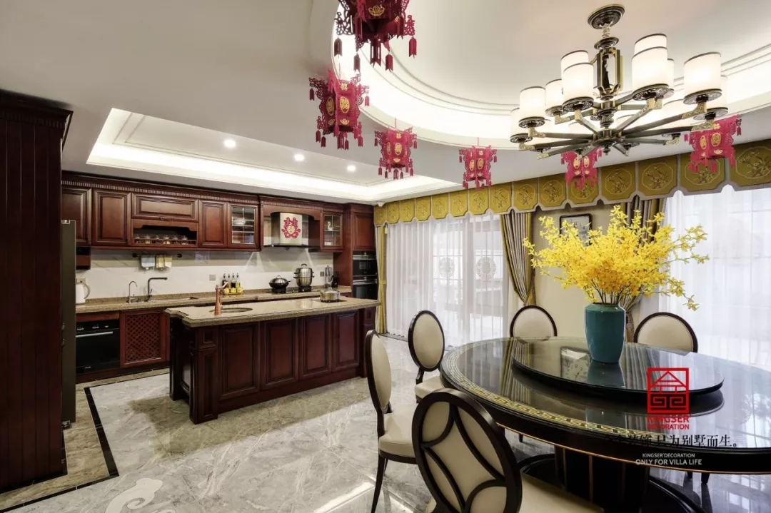 開放式廚房緊挨著以圓桌為主體的餐廳,中國人的傳統就是追求和和美美,用圓形的餐桌象征著團圓與和美。廚房的整體風格還是注重中式風格的廚房,只用中間出現的島臺才體現細節的差異。
