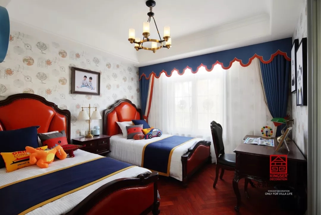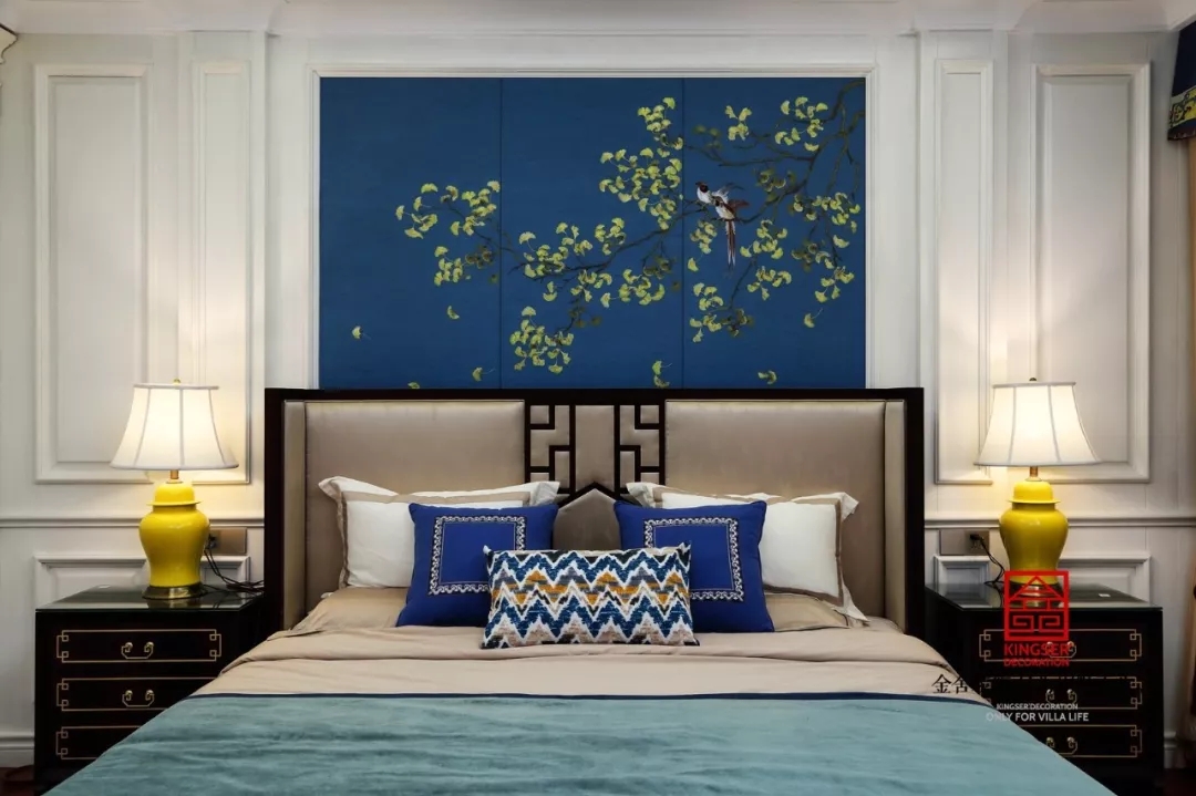 臥室“靜”與“凈”都藏在每一個元素里。內蘊悠遠,優雅從容,相伴入眠,讓夢境都變得詩意起來。臥室在配色上沒有考慮中式的傳統配色,而是用的紅色與藍色的配合,讓對比色擺脫傳統的中式氛圍,讓中式的感覺發生一個質的飛躍,讓時尚感充滿整個空間。