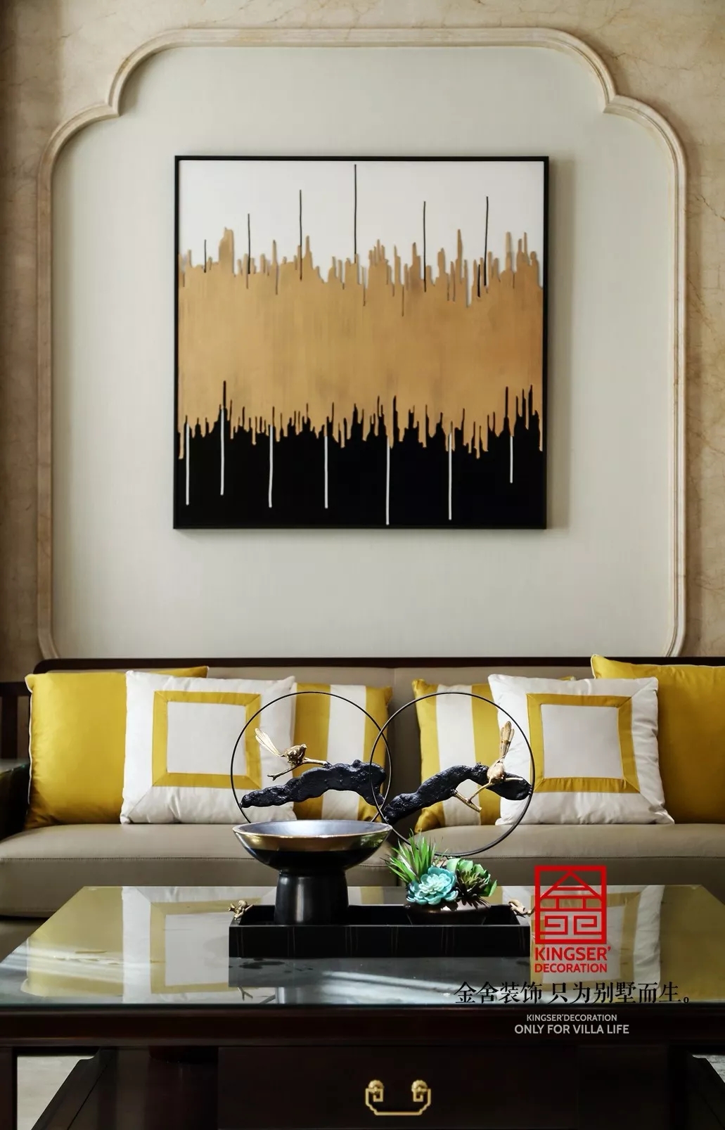 直線線條、對稱空間和深淺色變化的色調,這是中式韻味的基礎格調。天然大理石茶幾桌面,自然紋理,返璞歸真。亞麻色墻紙,比白色溫暖,比黃色低調,搭配任何顏色都不突兀。沙發背景的現代與古代風格的融合,即有點中式畫作的淡雅又有現代化作的抽象。君子淡泊,不爭不搶。