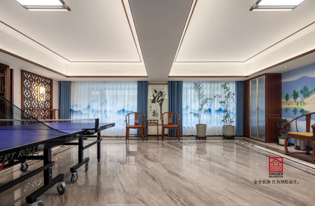 一個家居會所最不能缺少的就是娛樂的空間,乒乓球臺和影音室,晨沐朝霞、夜觀星斗,總有人想要脫開繁復的人事交集,體味中式元素之廣博。