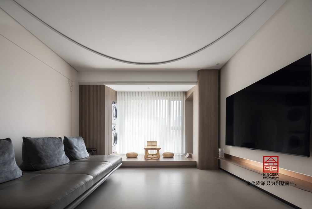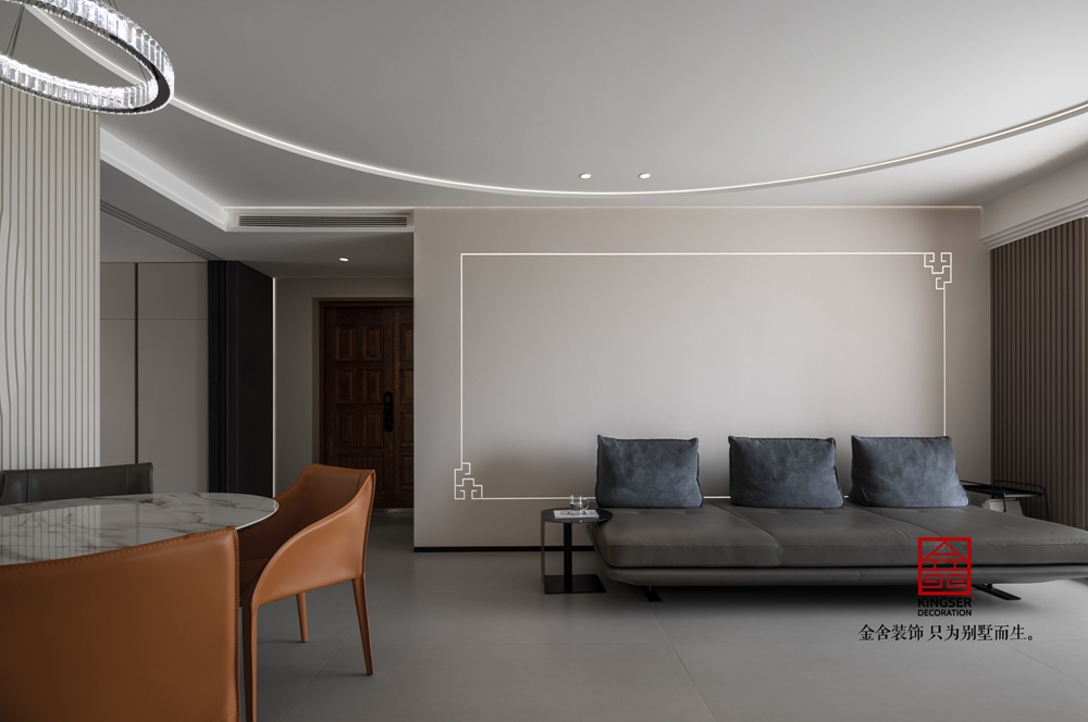 客廳空間沒有安置茶幾,這種無茶幾的設(shè)計 ,讓整個空間看起來更加的寬敞,本身就是一家五口,這樣的設(shè)置,也給了孩子足夠的運動空間,沙發(fā)背景墻用燈條拼接而成,中式紋理的也被制作了進去,讓整個空間充滿文化的氣息。