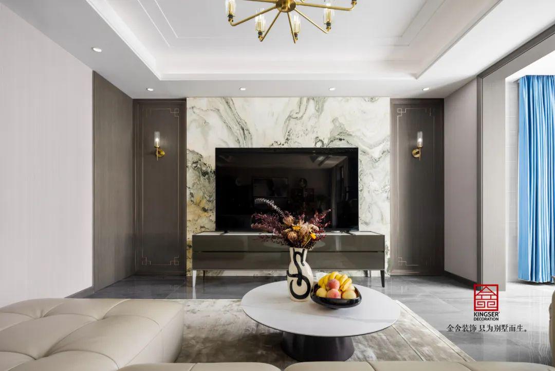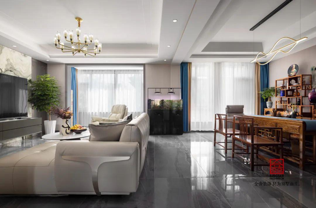 混搭的風(fēng)格讓空間看起來(lái)十分的特殊,現(xiàn)代輕奢的客廳與中式的書(shū)房合二為一,客戶是中年夫妻,對(duì)于生活還是十分有品味的。