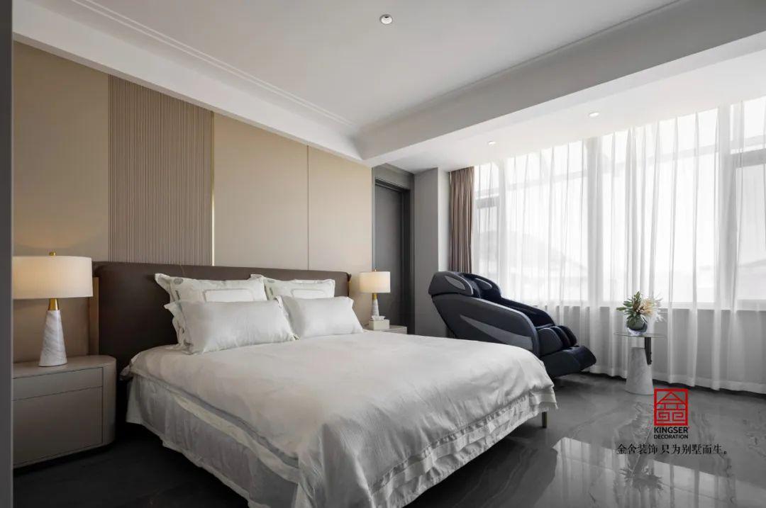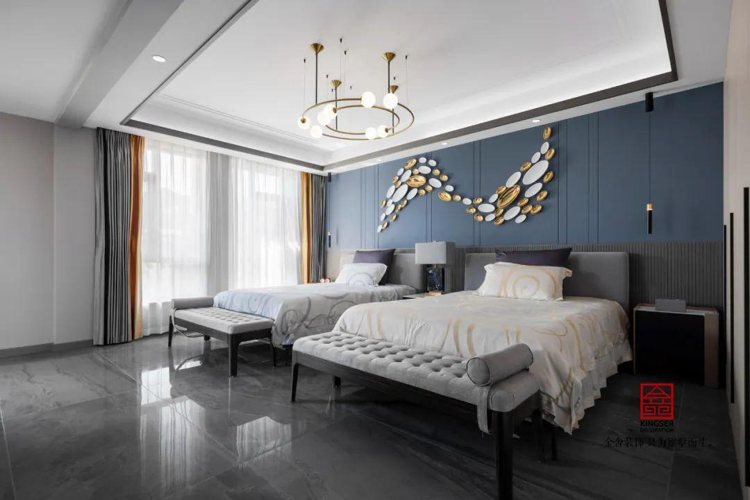 二樓通過(guò)功能分區(qū)實(shí)現(xiàn)臥室空間的最大化利用,主臥采用雙床錯(cuò)位布局提升睡眠舒適度,床頭背景墻以水波紋理裝飾營(yíng)造沉浸式睡眠氛圍。內(nèi)部獨(dú)立設(shè)置桑拿房與休閑陽(yáng)臺(tái),通過(guò)玻璃隔斷實(shí)現(xiàn)干濕分離,既滿足養(yǎng)生需求又延伸休閑功能。