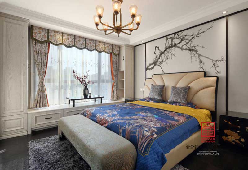 緞錦的寶石藍和絲綢的淺湖藍與背景墻象征這海天相接,相輔相成,每一個顏色都形成一種深遠的意境,或蕭瑟,或廣闊,或沉穩,或舒揚,不同的情景不同的韻味成就不同的家居舒適空間。