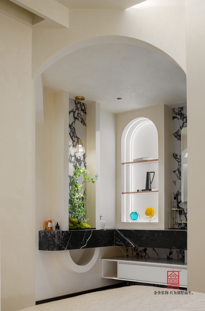 女孩房是典型的奶油風,通過兩房變一房的手法,再通過兩道拱形造型,使得兩個空間分離又關聯,更為突出的是干區洗手臺,寶格麗極具時尚感的材質和負一女孩房衣帽間玄關遙相呼應,整體感兼具。