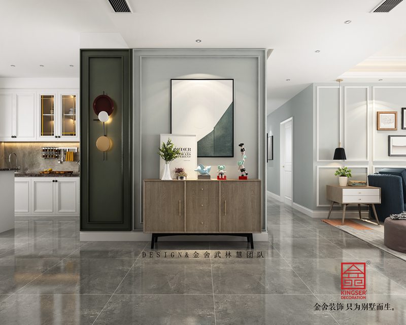 開門入戶,時尚混搭氣息撲面而來,左手邊是墨綠的靜謐與凹凸有致的線條搭配時尚跳色壁燈,金色與綠色在光照下的沖撞感,右邊棱角分明的玄關柜,黑色磨砂質感的金屬腿,呼應上精致復古的墨綠色掛畫邊框,每一個細節都將精美質感伶俐體現,一個時尚復古的北歐之家,就這樣映入眼簾……