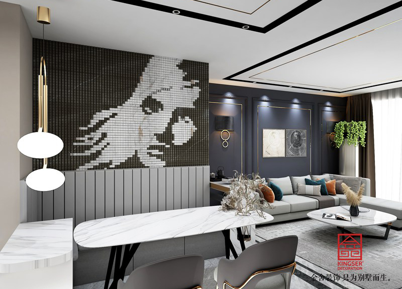 設計說明:現代輕奢的風格演繹手法,以其強對比的材質關系、精致細節來彰顯產品的高品質和輕奢感。現代港式風格注重居室的實用性,同時體現了現代大都會生活的雅致與時尚,符合現代人的新概念生活品味。 以獨特的審美視覺,將懷舊的港式情懷與現代生活需求相結合,入戶花園結合自然的舒適感,奏響時間維度的光影流動,推動歲月的齒輪,游弋其間,此唱彼和。 美好從歸家這一刻開啟,精致的玄關,打造出氣質獨特的玄關端景,那時尚的雕像活靈活現,仿佛期盼著歸家的主人,伸手撫順絨毛,將鑰匙皮包放入柜子,卸下浮沉的疲倦,在長椅上換上拖鞋,正式進入居家狀態。這是何種靜謐,何種愜意,促成“歸家團聚”的美好。