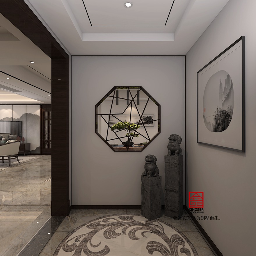 整體的色調以黑白灰為主,根據需求從新劃分功能空間,并參考了中式園林里面的造景手法,達到室內空間的“一步一景”。入戶玄關位置把原有的墻面做了一些拆改,透過中式八角窗,映入眼簾是茶室桌面上的盆景,兩個石獅子也體現了充分的中式元素。錯落的竹節燈,不僅起到了照明的作用,也有著著節節高升的寓意。家具造型簡約,采用棉麻、·胡桃木、金屬等材質打造空間內的氣質元素,與香道飾品完美融合,收放自如的詮釋了東方的精髓,讓人倍感上流社會的優雅與品味。