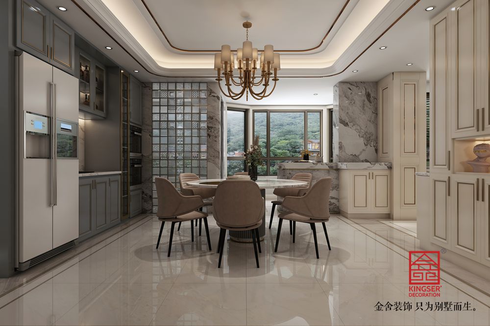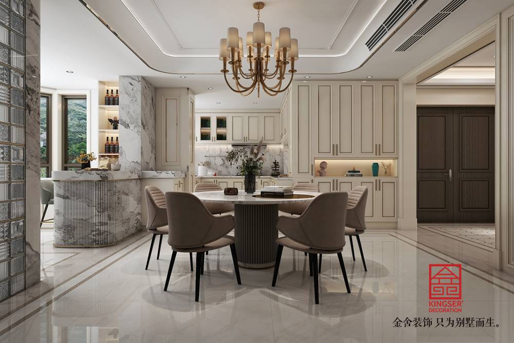 設計說明:此案例為石家莊金舍裝飾-榮盛華府205平米美式風格裝修效果圖。美式風格的客廳面積很大,看上去就很氣派,加上非常有質感的家具,盡顯奢華意境,美式風格的裝修很注重各種線條的裝飾,吊頂和墻面上都有美觀的線條,水晶吊燈更是增加了整個客廳的亮度,同時也提升了檔次,墻面上的掛畫非常有藝術氣息,體現了主人的文化底蘊,在這樣的客廳里家人一起休閑娛樂或是招待客人都是非常好的。