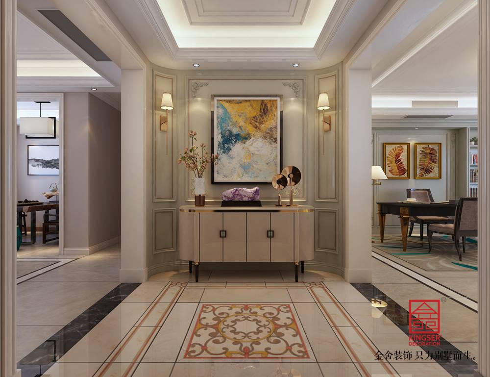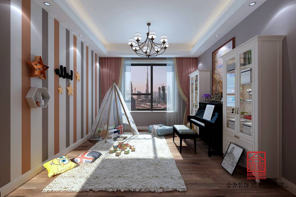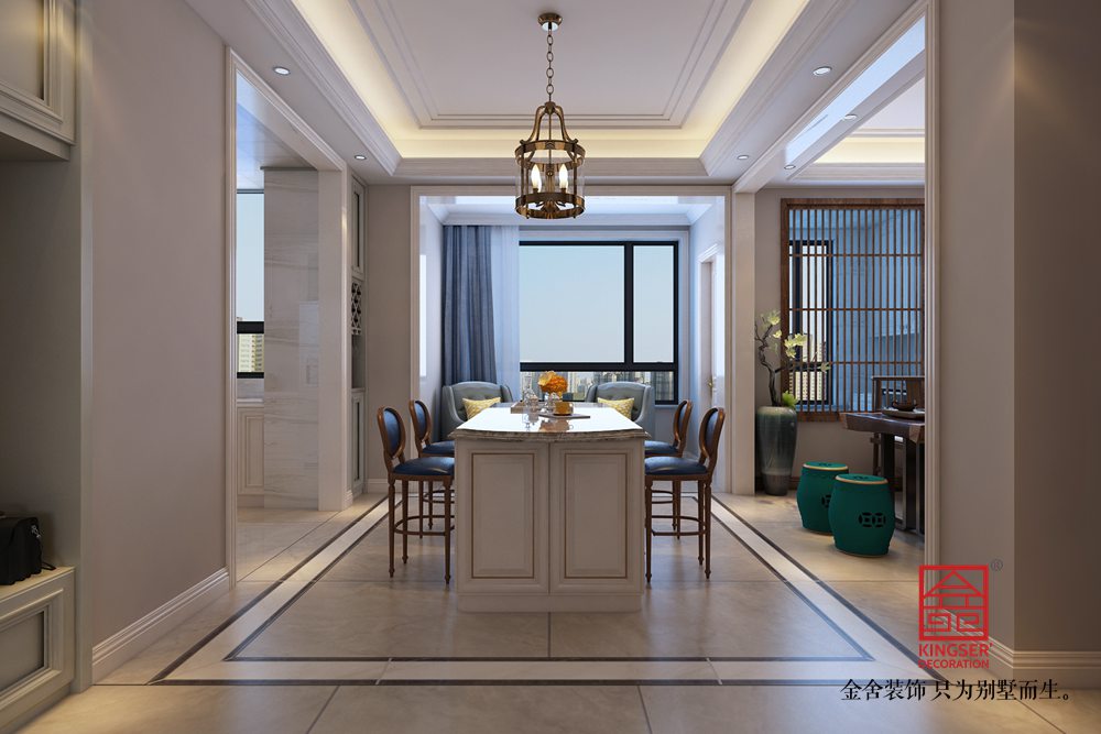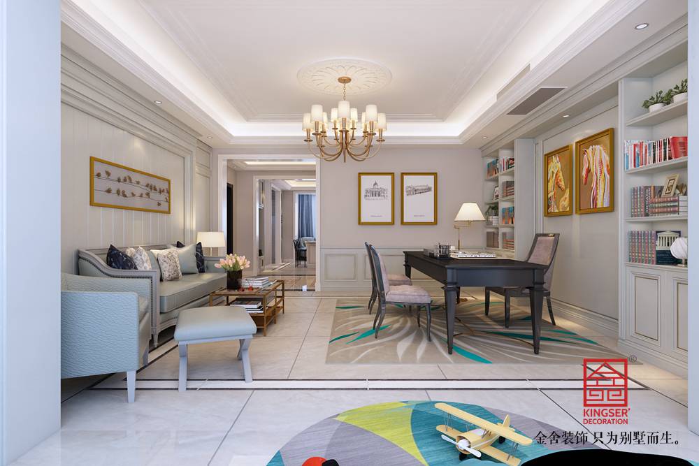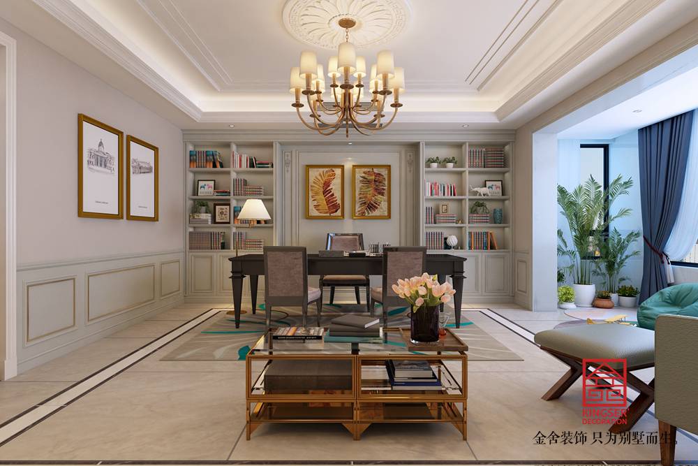 設(shè)計說明:此案例為石家莊金舍裝飾-榮盛華府200平米混搭風(fēng)格裝修效果圖。傳統(tǒng)的客廳以電視墻為主導(dǎo),沙發(fā)和茶幾的高度往往相差不大,這樣的高度差對于孩子寫作業(yè)或是成年人看書寫字和使用電腦是沒有舒適度可言的,因此一些有工作和學(xué)習(xí)需求的家庭可以考慮把家庭工作室融入客廳,利用靠墻的大操作臺和各種墻面擱板架,滿足多人工作的需求