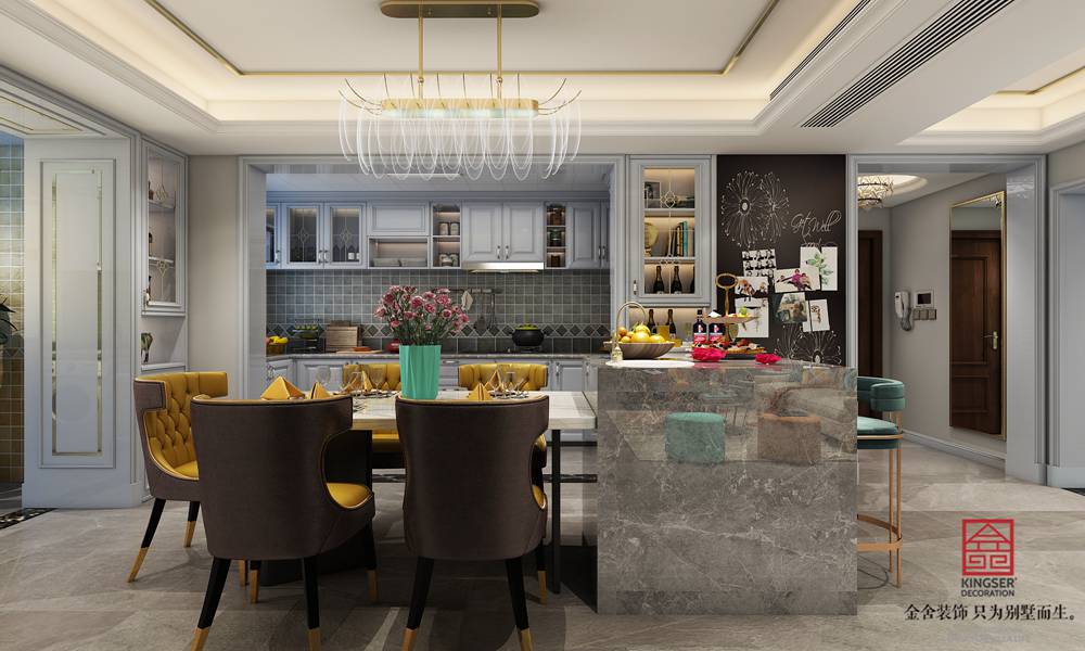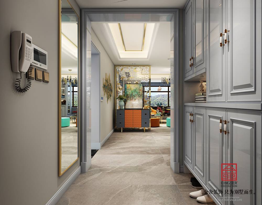 此方案是石家莊裝修公司-健康城160平米美式風格裝修效果圖。以美式輕奢定義的一種風格,美式輕奢在生活方式上延續了美式風格的輕松自由,又添加了一些當代元素。本案在裝飾手法上巧妙的運用了啞光的復古磚,隔斷玫瑰金不銹鋼,簡單的美式線條等來提升質感。以藍灰色為主調,超脫凡俗的藍灰調,將小資情調流露,彰顯輕奢大氣。入戶玄關開闊明亮,以灰藍色搭配著深色瓷磚做對比和呼應,簡潔的鋪貼與屋內美式輕奢氛圍呼應本案例,在看似漫不經心卻故意營造著一種十分溫和的輕奢表達。