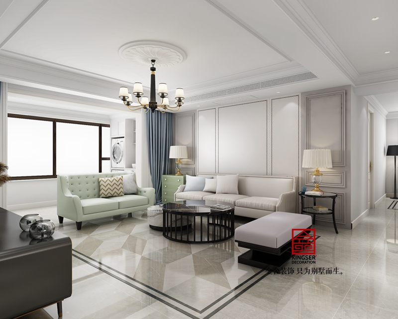 -榮盛華府185平米美式休閑風格裝修效果圖。它就猶如一個歡快的年輕人,輕快的走在田間小路上,它散發著陽光的溫暖與青草的幽香,讓人們體會到最簡單本質的快樂。整個設計作品采用莫蘭迪色系,營造出一個清晰文藝的休閑空間。置身客廳,以米白色為基調,淺米白亮色硬包雅灰色木飾面帶來舒適靜心的視覺感受,淡綠色布藝沙發與天藍色窗簾對應承接,來表現空間獨有的意識形態。
