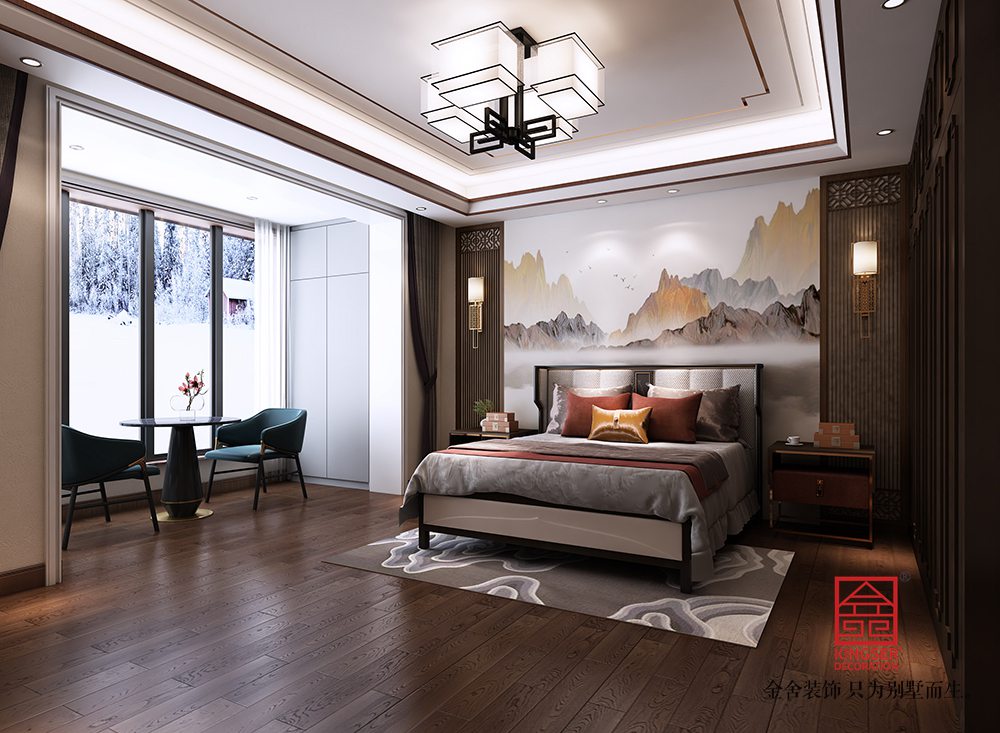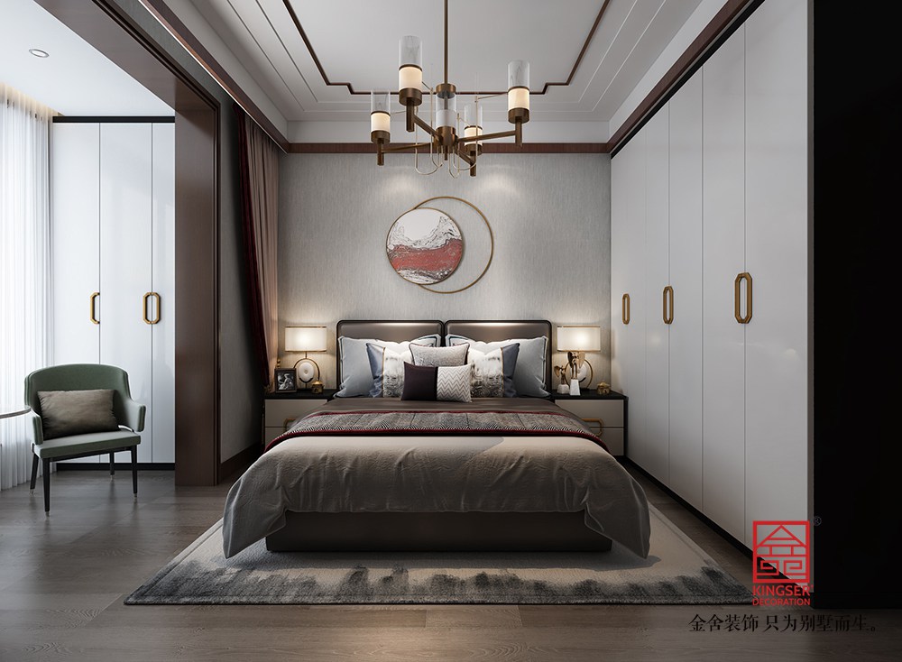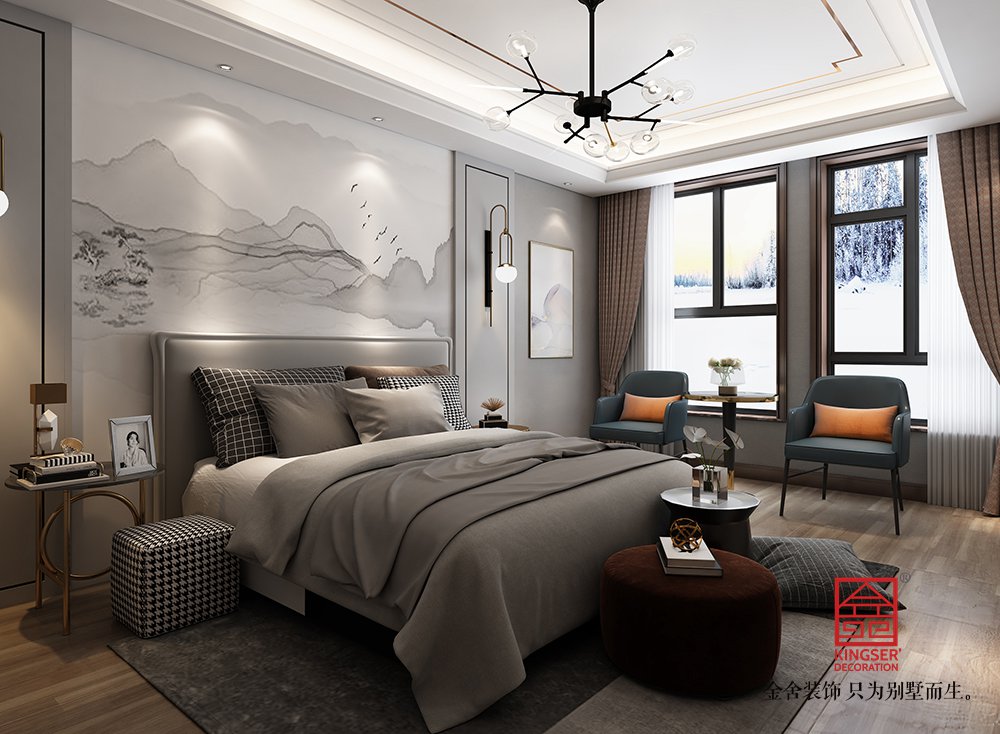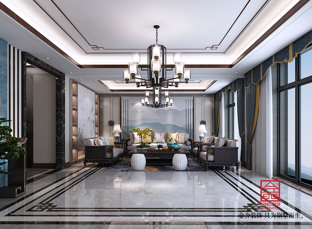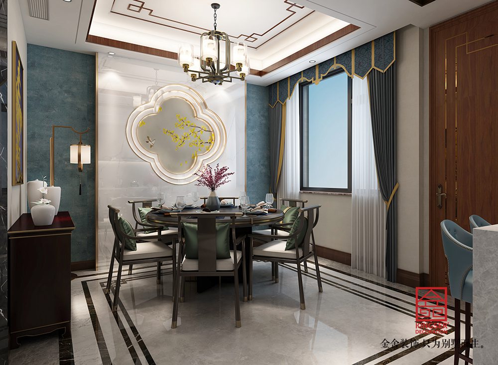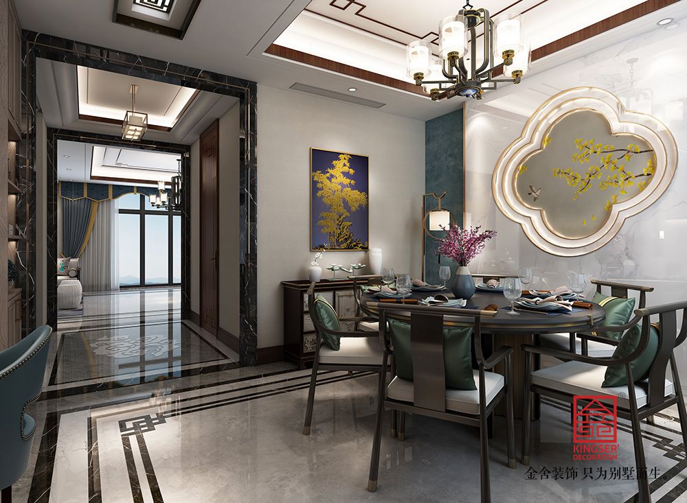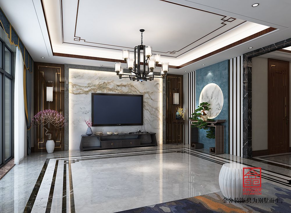 設計說明:此案例為石家莊金舍裝飾-大者280平米新中式風格裝修效果圖。將現代元素與傳統元素相互結合的形式而產生的,同時以現代人的觀點來體現出與傳統中國風格不一樣的設計。同時新中式風格大多數采用對稱性的設計,體現出一定的協調性。中國傳統的室內陳設包括字畫、匾幅、掛屏、盆景、瓷器、古玩、屏風、博古架等物品來體現出中式風格,同時為了體現出室內的現代感,又將中式古典的特色的裝飾物進行現代風格的再次設計,體現出新中式風格設計理念。
