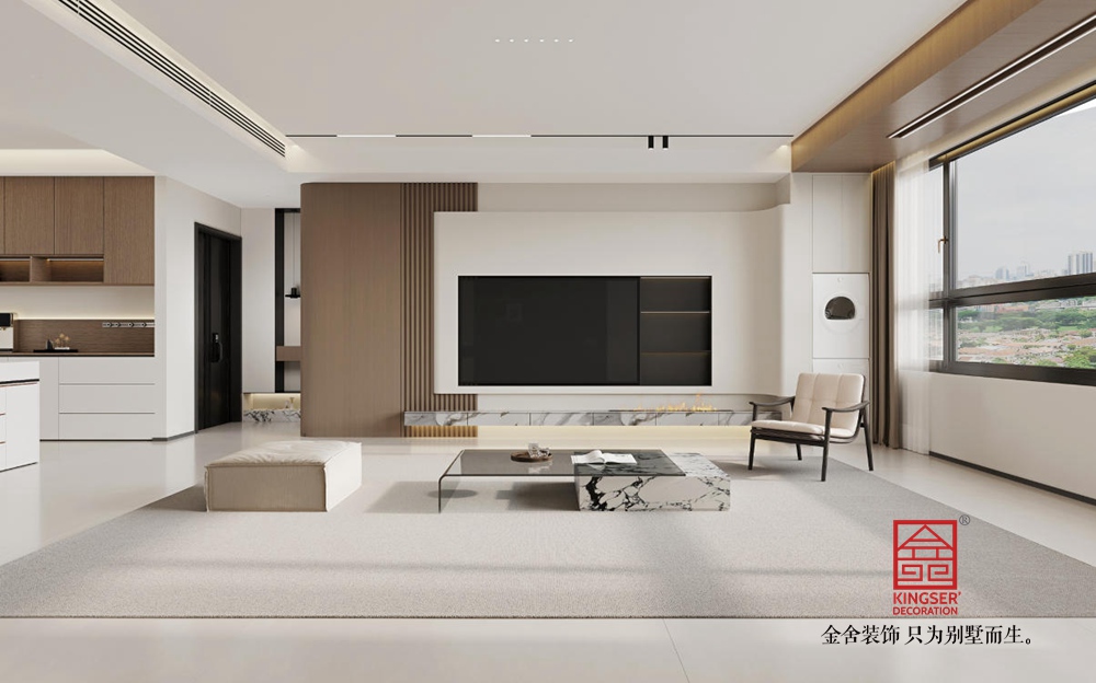 空間布局上,采用開放式設計,讓客廳與周邊區域自然銜接,增強了空間的通透感與互動性。大面積的落地窗是設計亮點,引入充足自然光線,同時將城市景觀納入室內,使空間與外界環境有機融合。