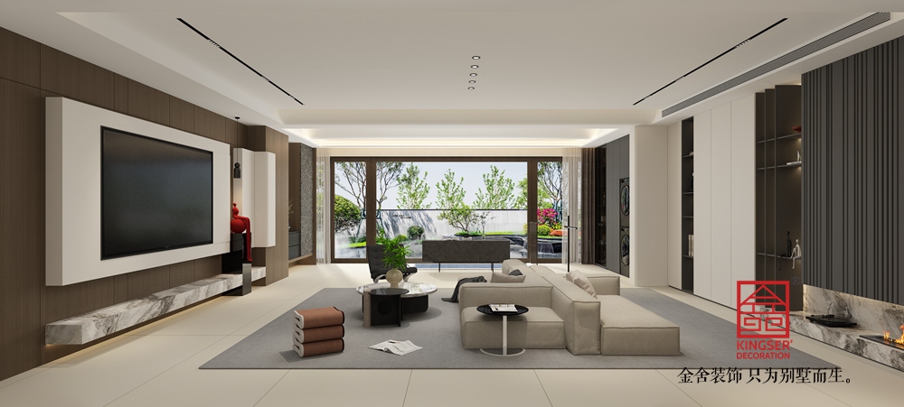材質上,木質墻面傳遞自然溫潤,大理石元素增添精致感,不同材質的碰撞讓層次更豐富。布局上,寬大的米色組合沙發成為空間核心,圍繞電視背景墻,構建出舒適的社交與休憩場域,背景墻簡約大氣,與整體風格相得益彰。