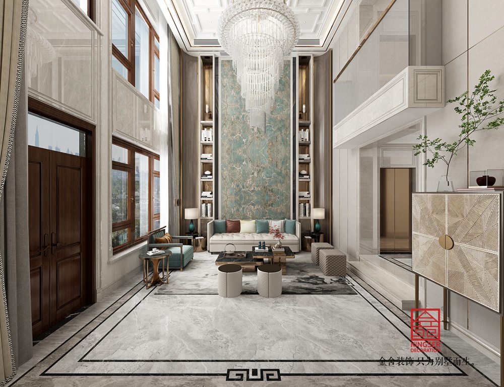 設計說明:本別墅客廳設計,以現代輕奢風格為基調,融合精致與大氣??臻g上,挑高設計搭配水晶吊燈,拉伸視覺,營造開闊感。材質運用考究,大理石墻面與地面,紋理自然且質感高級,金屬元素在家具、裝飾線條中點綴,增添奢華感。色彩以淺色系為主,搭配局部藍綠色軟裝,柔和又富有層次。整體布局兼顧功能與美學,家具造型簡約大氣,細節處盡顯精致,打造出舒適且具品質感的別墅起居空間。