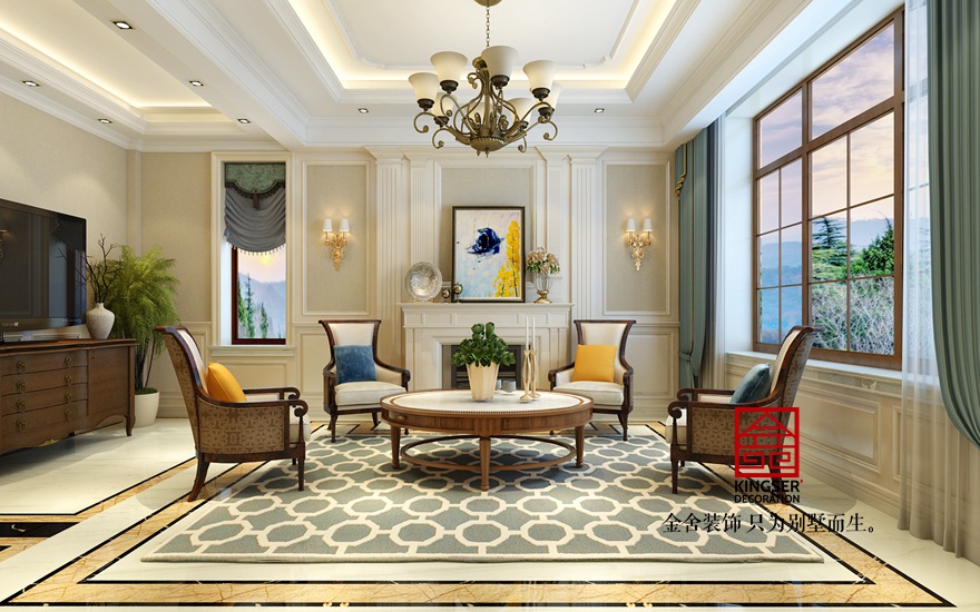 設(shè)計(jì)說明:此案例為石家莊金舍裝飾-大者別墅300平米美式風(fēng)格裝修案例。本案采用了簡單明了的淺色調(diào)的清新美式風(fēng)格,整體的色調(diào)采用了淺米黃色的素色壁紙,加之乳白色簡潔造型,精致的銅鑄吊燈,使得整個(gè)空間錦上添花,質(zhì)樸而不奢華。搭配亮色布藝和簡潔干練的美式家具,使得整個(gè)空間簡潔大方,質(zhì)樸典雅,完美的符合了業(yè)主提出的“簡潔而不簡單”的設(shè)計(jì)理念。