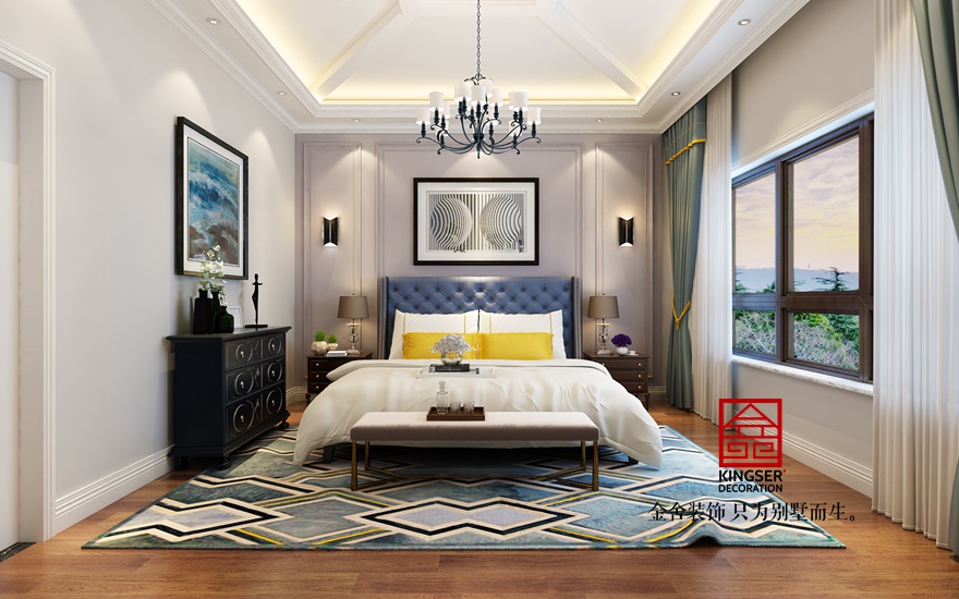 主臥在放高足夠的情況下采用了“回”字形吊頂,第二階的“口”字形造型把整個(gè)空間向上拉伸,顯得空間更加寬敞、高大。考慮到臥室的休息性,在色調(diào)上采用了淺灰色作為背景墻的主色調(diào),即溫和又不會(huì)顯得沉悶,有助于提高業(yè)主的睡眠質(zhì)量。經(jīng)典的美式“三段式”’造型,沒有過多復(fù)雜邊線,簡潔干練,搭配頗有現(xiàn)代感的金屬燈飾及飾品,使整個(gè)空間簡而不失潔時(shí)尚。整體的方案圍繞清新的美式風(fēng)格的簡單舒適,質(zhì)樸典雅來設(shè)計(jì),